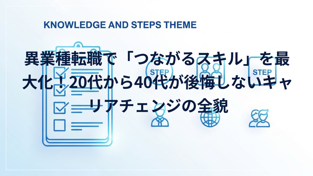 今の仕事にモヤモヤを感じていませんか?「異業種への転職なんて夢のまた夢」とか、「自分には特別なスキルがないから無理」なんて、そう思っていませんか。でもね、ちょっと待ってください。実は、あなたの持っている「つながるスキル」こそが、新しいキャリアの扉を開く鍵になるんです。このブログでは、20代から40代の皆さんが、自分にぴったりの転職先を見つけ、後悔のないキャリアチェンジを実現するための具体的な道筋を、親身にそして論理的に解説していきます。さあ、一緒にあなたの可能性を広げる旅に出ましょう!